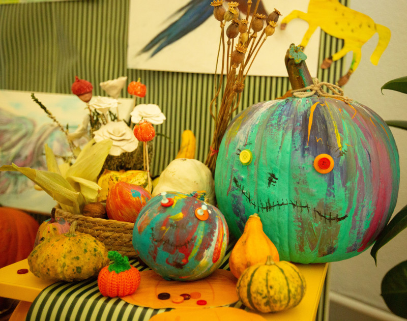 Maľované tekvice akryl, tempera, tuš a gombíky ZŠ Slobody 1