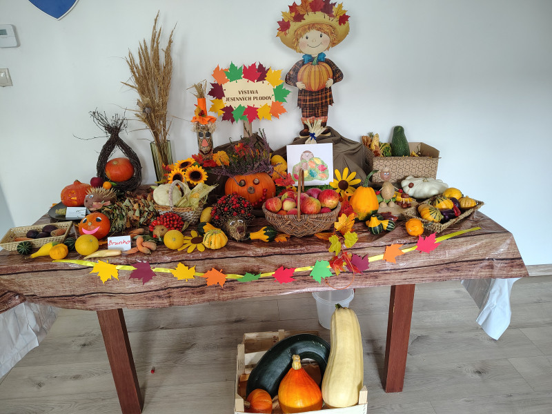 Obdivovali sme krásne naaranžované košíky a misky plné voňavých plodov našich záhrad a polí. Spestrením boli farebné tekvice rôznych tvarov a veľkostí, veselé výrobky z jesenných plodov a svietiaca tekvica.