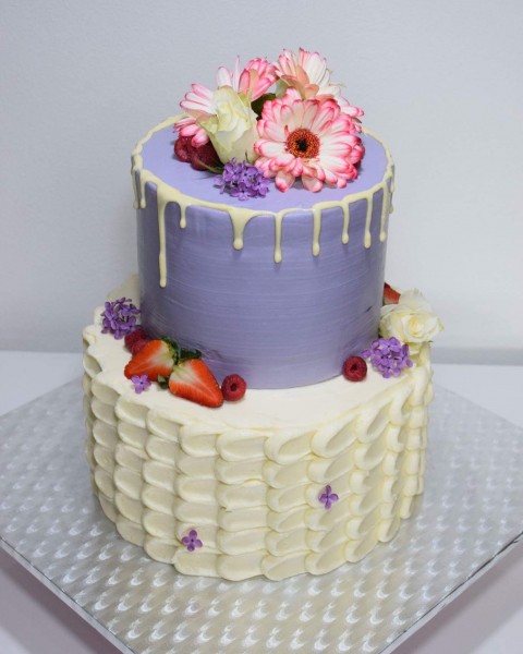Poachodová tortička plnená mascarpone krémom a lesným ovocím. Dozdobená čerstvým ovocím a živými kvetmi.