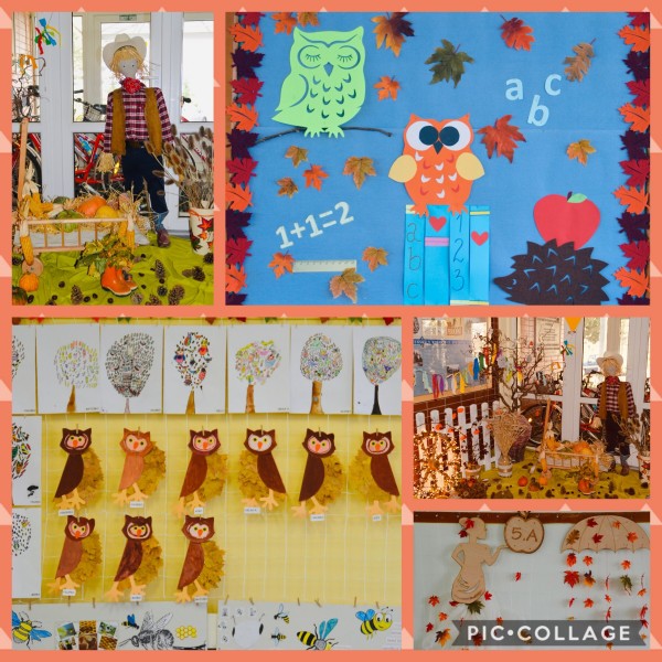 Školské nástenky a stršiak Rudko pri vstupe do školy.
