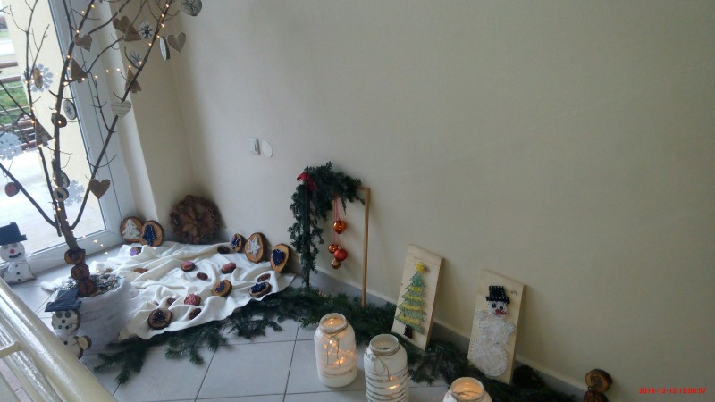 Nástenka to nie je, ale v pravidlách je uvedené, že je to súťaž o najkrajšiu nástenku, či výzdobu školy, triedy. Preto sme sa rozhodli zapojiť, aby sme ukázali, ako žiaci dokázali využiť rôzny odpadový materiál - kartón na ozdoby na stromčeku, rám zo starej nástenky na fixy, drevené kolieska narezané zo suchého stromu na školskom dvore, ktorý bolo treba vyrezať, fľaše zo školskej jedálne. Použili pri tom zvyšky bavlny a zapojili sa dievčatá aj chlapci, ktorí s radosťou pritĺkali klince. Výzdobu sme umiestnili vo vchode do školy a nedalo sa nám to lepšie odfotiť kvôli zábradliu - cieľ bol vyzdobiť tento priestor, nie fotiť pre súťaž, no keď bola príležitosť, pokúsili sme sa ju využiť.