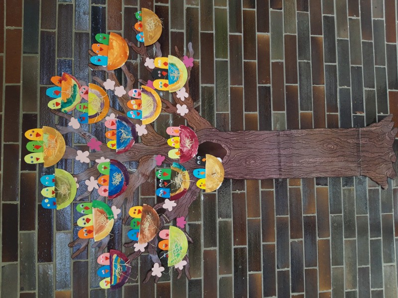 Strom vysoký takmer 2 metre. Deti robili vtáčatká z papiera a hniezda z papierových táciek vo vlastnom farebnom prevedení.