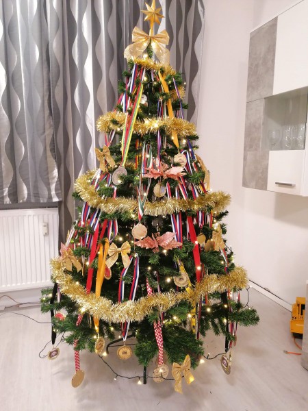 Originálne ozdobený vianočný stromček medailami 10 - násobnej majsterky sveta a Európy v armwrestlingu - pretláčaní rukami.