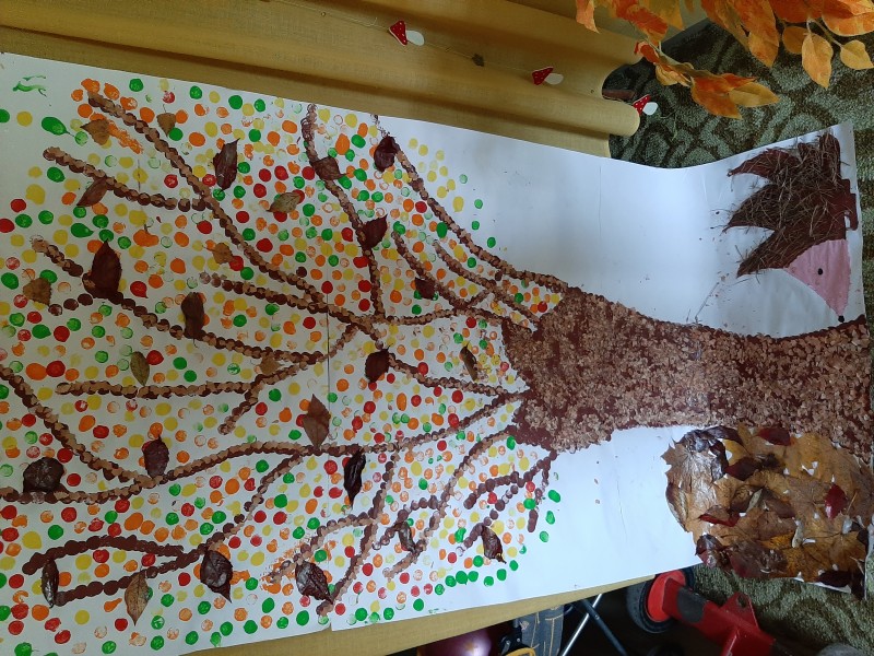 KOLÁŽ-spojenie viacero techník(odtláčanie špongie,korkových zátiek,prstov,maľovanie ježka,lepenie vylisovaných listov,ihličia,stružliniek z drevených pasteliek.