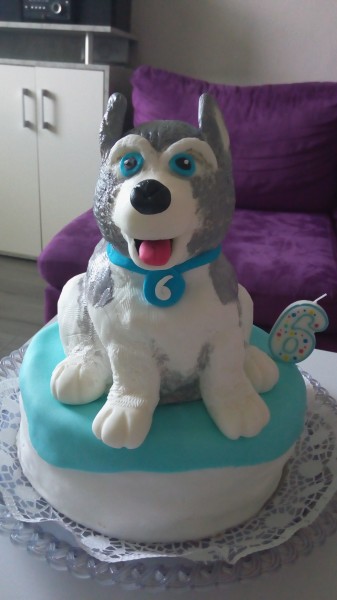 Torta sa skladá, spodok dobošová torta a vrch -Husky je ovocná. Vyrobila som ju pre moju dcerku, ktora miluje psov.