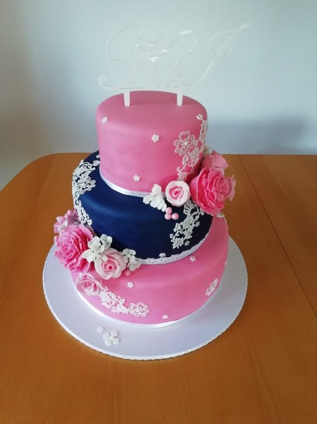 Svadobná torta v ružovo-modrej kombinácii, modelovanými kvetmi a jedlou čipkou.
