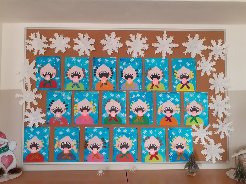 Deti vystrihovali snehové vločky, ktoré sú po kraji nástenky. Výtvarné práce-pozadie maľované anilínovými farbami kombinované so soľou, čo vytvorilo efekt snehu. Tváre deti vystrihovali, nalepovali.