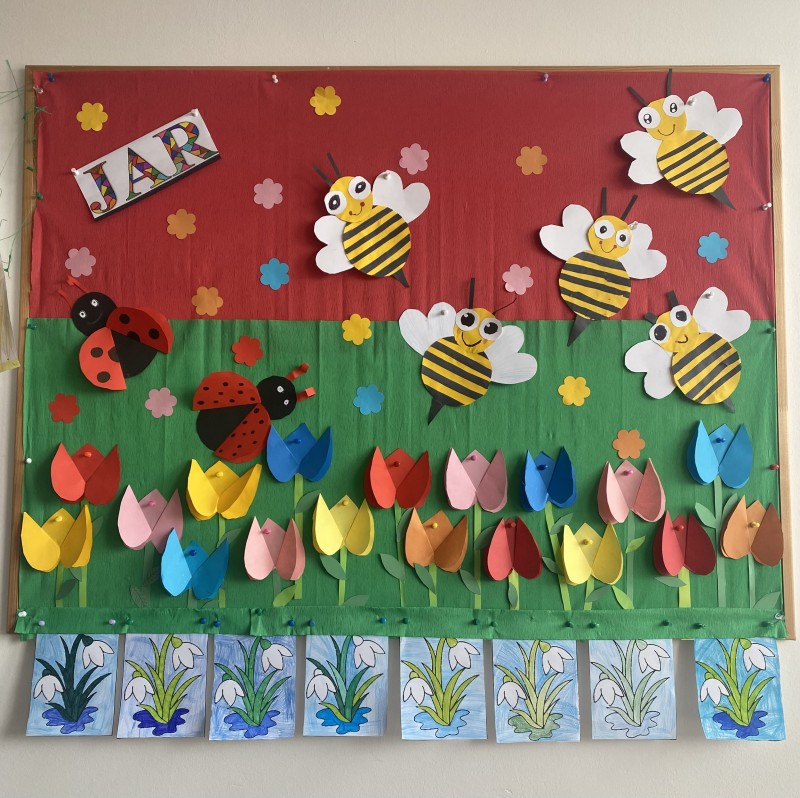 Žiaci 2. A vytvorili svojimi prácami krásnu jarnú nástenku. Základná škola Rovinka.