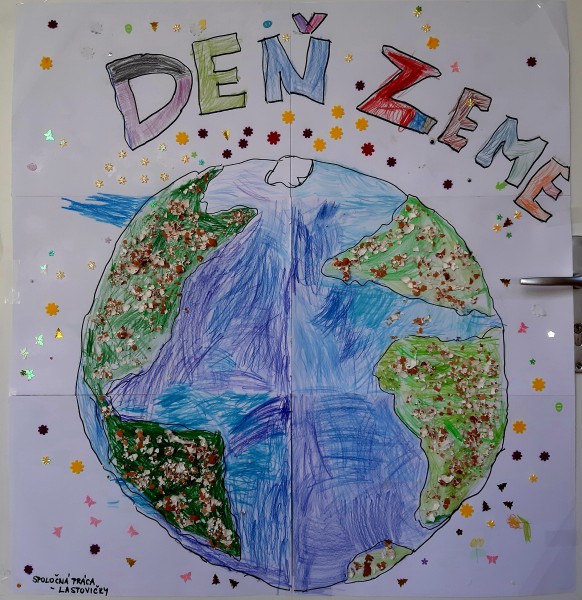 Plagát vytvorili spoločne deti zo zmiešanej vekovej skupiny MŠ. Téma: Recyklácia. Použitý materiál: pastelky, papier, lepidlo, škrupiny z vajíčok.