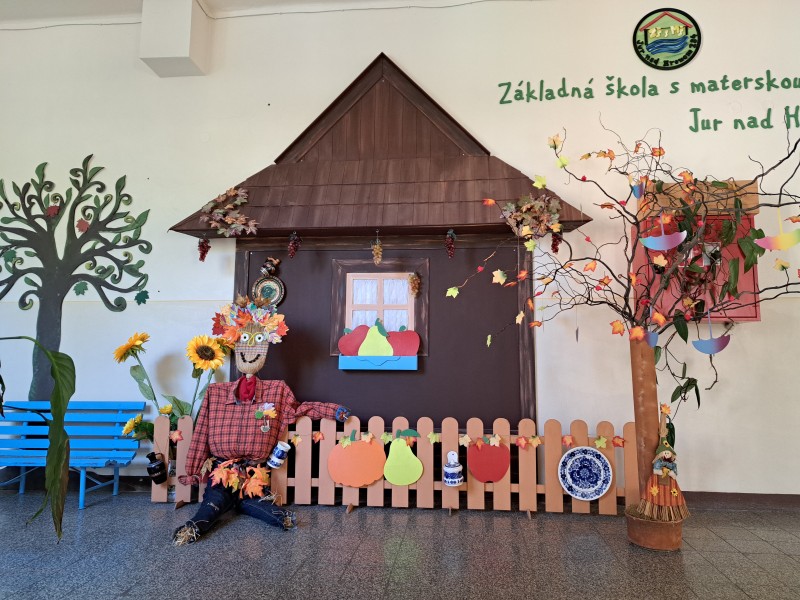 Jeseň, pani bohatá, rozžiarila jurčatá, vyzdobila školu celú, náladu spravila skvelú.