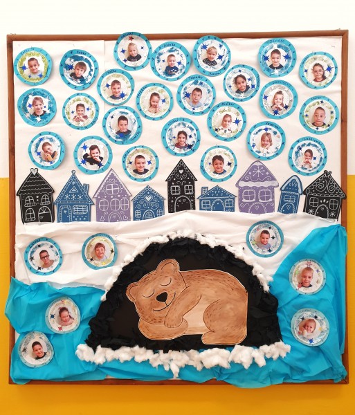 Toto je naša zimná nástenka na chodbe našej MŠ. Snehové vločky, dopadajúce na brlôžtek medvedíka, zdobia usmiate tváričky našich milých detičiek.